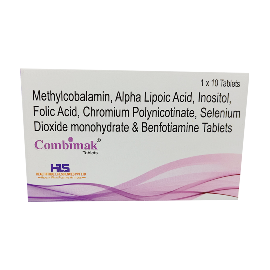 Combimak is a neuro-nutritional formulation combining Methylcobalamin, Benfotiamine, Alpha-Lipoic Acid, Folic Acid, Chromium Polynicotinate, Inositol, and Selenium, designed to support nerve health and metabolic balance. It is commonly used in the management of diabetic peripheral neuropathy, nutritional deficiencies, and conditions associated with oxidative stress and nerve damage. Alpha-Lipoic Acid provides antioxidant protection and improves nerve conduction, while Benfotiamine and B-vitamins enhance cellular energy metabolism and help regulate homocysteine levels. Methylcobalamin and Folic Acid aid in neuronal repair and myelin synthesis, while Chromium and Inositol contribute to glucose metabolism and nerve signaling. Selenium adds additional antioxidant support, protecting cells from free radical damage. Available in oral tablet form, Combimak is typically packaged in blister packs, making it a convenient and effective option in neuro-nutritional therapy.